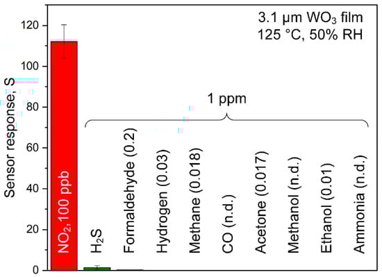 Selectivity. Sensor responses of the thickness-optimized 3.1 µm WO3 film to 100 ppb of NO2 and 1 ppm H2S, formaldehyde, hydrogen, methanol, CO, acetone, methanol, ethanol, and ammonia at 50% RH (at 23 °C). Please note that no response was detectable for CO, methanol, and ammonia.