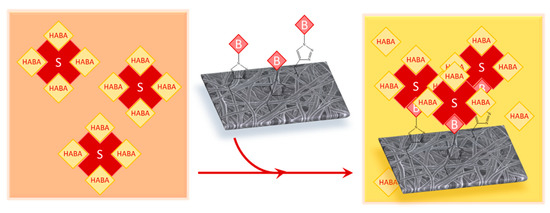 The click reaction yield was quantified using HABA colorimetric assay and XPS. Figure 5 describes the HABA assay process for the biotin-cellulose nanofiber membrane samples. Each sample was given sufficient time to allow for the streptavidin-HABA complex to diffuse through the porous membrane and reach all available biotin molecules bound to the surface of the nanofibers.