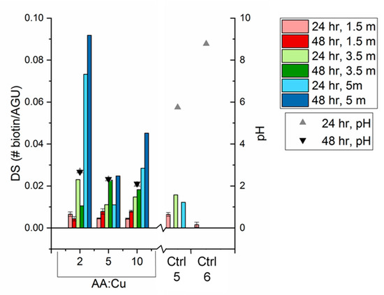 Degree of substitution of biotin on cellulose nanofibers, calculated from HABA colorimetric assay, increases with pH of reaction conditions and aging over a period of 5 months. All samples were stored in air for 5 months, and portions of each sample were assayed at 1.5, 3.5, and 5 months. Full reaction samples were tested at 2, 5, and 10 ascorbic acid-to-copper ratio (AA:Cu) for 24 and 48 h reaction times. All controls were quantified, and only Controls 5 and 6, shown here, had detectable biotin.