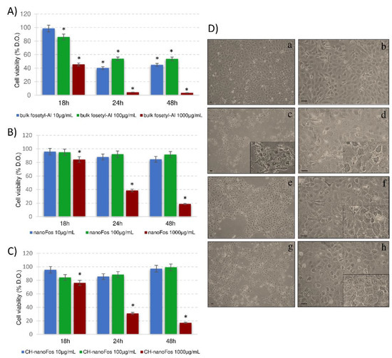 (A–C), 3-(4,5-dimethylthiazol-2-yl)-2,5-diphenyltetrazolium bromide salt (MTT) assay of (A) bulk fosetyl-Al; (B) nanoFos; (C) CH-nanoFos. The viability measured as indicated in the Methods section represents the values as percentage of the respective control (untreated cells) ones from three independent experiments considered as 100%. Asterisks indicate significant values (p ˂ 0.05) from the respective untreated control cells. (D) optical microscopic (OM) micrographs show HaCat cells in culture. (a,b) untreated HaCat cells (100% of viability); (c) HaCat cells treated with bulk fosetyl-Al 1000 µg/mL; (d) HaCat cells treated with bulk fosetyl-Al 100 µg/mL; (e) HaCat cells treated with nanoFos 1000 µg/mL; (f) HaCat cells treated with nanoFos 100 µg/mL; (g) HaCat cells treated with CH-nanoFos 1000 µg/mL; (h) HaCat cells treated with CH-nanoFos 100 µg/mL. Bar = 20 µm.