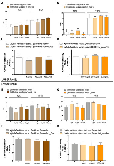 Fosetyl-Al and fosetyl-Al nanoformulations efficacy on Xfp strain De Donno and Xylella fastidiosa subsp. fastidiosa (Xff) strain Temecula1 planktonic and biofilm growth. Efficacy of Fos and nanoFos (100 µg/mL, 10 µg/mL and 1 µg/mL) on Xylella fastidiosa subsp. pauca (Xfp) strain De Donno (A,C) and Xff strain Temecula1 (E,G) planktonic growth. Products dilutions are reported in the axis; the ordinate reports the -ΔCt value that represents the difference between the Ct value obtained at each time point (6,15 days) and the Ct value at time 0 (T6-T0; T15-T0). Efficacy of Fos and nanoFos (100 µg/mL, 10 µg/mL and 1 µg/mL) on Xfp strain De Donno (B,D) and Xff strain Temecula1 (F,H) biofilm production. The axis reports the products dilutions; the ordinates report the spectrophotometric absorbance of crystal violet at 15 days. Data are expressed as means ± S.D. (n = 9, experiment repeated 3 times with different inoculum).