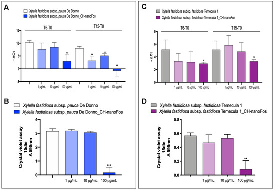 Fosetyl-Al and chitosan-based fosetyl-Al nano-formulations efficacy on Xfp strain De Donno (left panel) and Xff strain Temecula1 (right panel) planktonic growth and biofilm production. Efficacy of CH-nanoFos (100 µg/mL, 10 µg/mL and 1 µg/mL) on Xfp strain De Donno and Xff strain Temecula1 planktonic growth (A,C) and biofilm production (B,D). CH-nanoFos dilutions are reported in the axis; the ordinate reports, in A/C, the −ΔCt value (difference between the Ct value obtained at 6, 15 days and the Ct value at time 0) and, in B/D, the spectrophotometric absorbance of crystal violet at 15 days. Data are expressed as means ± S.D. (n = 9, experiment repeated 3 times with different inoculum; * p < 0.05, ** p ≤ 0.005, *** p = 0.0001 vs. Ctr).