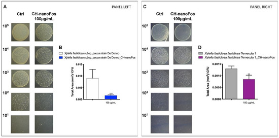 Bacteriostatic/bactericide effect evaluation on Xfp strain De Donno (left panel) and Xff strain Temecula1 (right panel). (A,C) 10 μL of decimal dilutions from 105 to 101 CFU mL−1 of Xfp strain De Donno and Xff strain Temecula1 were spotted on PD2 agar plates poisoned or not with CH-nanoFos (100 µg/mL, 10 µg/mL) and incubated at 28 °C (B,D). The total area and the number of bacterial colonies grown on 102 drops, represented as a ratio between total mass area and CFU grown were counted using ImageJ software. Data are expressed as means ± S.D. (n = 8, experiment repeated 2 times with different inoculum; ** p ≤ 0.005, *** p = 0.0001 vs. Ctr).