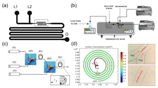 Figure 1. (a) Schematic illustration of microfluidic channels containing two liquid inlets (L1 and L2) and one outlet (O) for the preparation of silica nanoparticles (reproduced from [23], with permission from the American Chemical Society, 2004). (b) Experimental setup for the continuous synthesis of nanoparticle (reproduced from [24], with permission from the Elsevier, 2011). (c) Schematic diagram of microfluidic reactor systems with (S1) syringe for tetramethoxysilane (TMOS), (S2) syringe for 1 mM HCl, (S3) syringe for polyethylenimine (PEI) polymer in Tris–HCl buffer solution, (M1) and (M2) PEEK Y-shape mixers, (R1) reaction tube for hydrolysis, as well as (R2) reaction tube for silica precipitation (reproduced from [25], with permission from Elsevier, 2011). (d) Simulation and experimental results of reactants mixing in the spiral microchannel (reproduced from [26], with permission from Springer Nature, 2017).