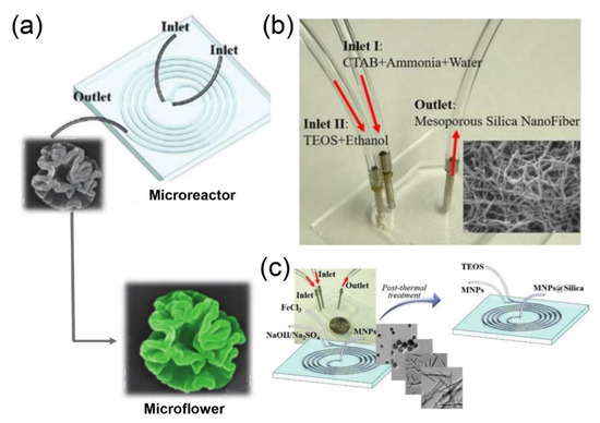 Figure 3. (a) Schematic illustration for the microfluidic synthesis of silica nanoflowers (reproduced from [93], with permission from the Royal Society of Chemistry, 2018). (b) Experimental setup for the microfluidic synthesis of silica fibers (reproduced from [30], with permission from the American Chemical Society, 2018). (c) Microfluidic synthesis of Fe2O3-SiO2 nanomaterials for circulating tumor cell screening (reproduced from [32], with permission from the Royal Society of Chemistry, 2018).