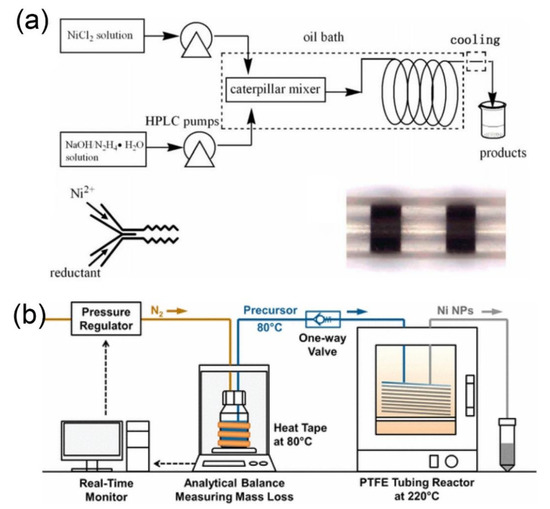 Figure 4. (a) Schematic illustration of the micro-reaction process for synthesis of crystalline nickel nanoparticles using an oil bath-heated capillary-type mixer (reproduced from [45], with permission from the Elsevier, 2012). (b) Reactor system for the continuous flow production of nickel nanoparticles (reproduced from [46], with permission from the American Chemical Society, 2017).