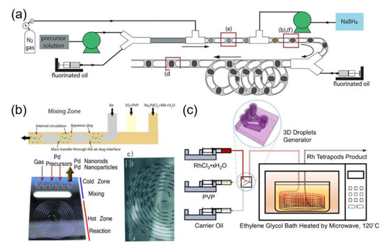 Figure 6. (a) Schematic illustration of the triphasic segmented flow reactor for the synthesis of ultra-small palladium nanoparticle (reproduced from [50], with permission from the Royal Society of Chemistry, 2017). (b) Schematic illustration of the segmented flow generated in the mixing zone of a hydrophilic microfluidic reactor (reproduced from [51], with permission from the Wiley-VCH Verlag GmbH & Co, 2016). (c) Schematic illustration of the two-phase flow microfluidic system for fabrication of rhodium tetrapod product (reproduced from [52], with permission from the American Chemical Society, 2017).