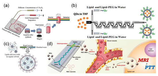 Figure 11. (a) Schematic illustration for the synthesis process of Fe3O4-Au nanoparticles, by using natural-rubber microdevice (reproduced from [95], with permission from the Royal Society of Chemistry, 2015). (b) Schematic illustration of the QD-liposome formation in the Tesla mixer (reproduced from [150], with permission from the American Chemical Society, 2010). (c) Schematic illustration of the rapid mixing of lipids and IONPs in microfluidic device (reproduced from [151], with permission from the Royal Society of Chemistry, 2017). (d) Microfluidic electroporation-facilitated the synthesis of cell membrane coated magnetic nanoparticles for enhanced imaging-guided cancer therapy (reproduced from [153], with permission from the American Chemical Society, 2017).