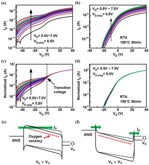 ID–VG transfer curves measured at different VD (a) after low vacuum treatment (b) after RTA in oxygen ambient (150 °C for 30 min); (c,d) ID–VG transfer curves of (a) and (b), respectively, normalized with respect to ID at VG = 40 V; (e) Schematic band diagram for the case having VG below the transition voltage (VTr). Trap-assisted tunneling (TAT) current (green arrow) increased via an oxygen vacancy level near the conduction band of ZnO; (f) Schematic band diagram for the case having VG above VTr. The current (green arrow) flows through the Schottky barrier at source/channel and channel/drain without being affected by oxygen vacancies. The small red circles denote the expected energy level of oxygen vacancy.