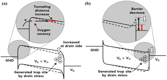 Next, to estimate the effects of oxygen vacancies on the Schottky barrier at the channel/drain junction, constant voltage stress was performed as shown in Figure 3. In this process, negative drain bias stress was applied to the drain side (VD.stress = −2.5 V, VG.stress = 0 V) to probe the degradations in the channel/drain junction region. As the stress time increased, ID gradually changed from the red to the blue line as shown in Figure 3a. The ID drastically decreased at the VG region below VTr and this trend is reversed at the VG higher than VTr. This drastic decrease can be explained by the migrated positive charges at the drain side as illustrated in Figure 4a, which increases the TAT distance at the source side.