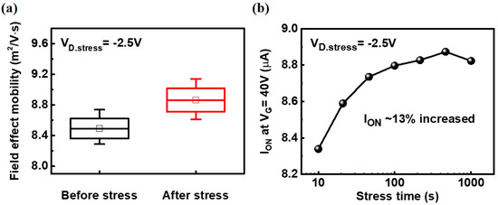 Finally, the impact of constant voltage stress on the field effect mobility and on–current is investigated as shown in Figure 5. Interestingly, the field effect mobility increased after the stress, from 8.5 m2 V−1·s−1 to 8.9 m2 V−1·s−1, because the swing of ID–VG curve actually improved as shown in Figure 3a. This result is due to the suppression of subthreshold leakage current caused by the tunneling distance increase at the low gate bias region which can be explained with the band diagram shown in Figure 4a, which in turn improves the swing. The on-current values in the high field region were also enhanced after the stress by ~13% as shown in Figure 5b. This result can be explained by the band diagram shown in Figure 4b. After the negative drain bias stress, the traps accumulated in the drain side improve the channel conductivity due to the trap-induced Schottky barrier lowering effect.
