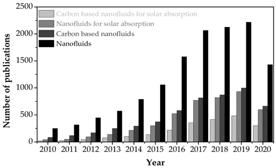 In this type of collector, solar irradiation is directly absorbed and transformed into heat by the working fluid. Because the conventional fluids exhibit poor adsorptive capacity of the solar spectrum range (0.25 µm < λ < 2.5 µm) [7,17], new working fluids with enhanced thermal properties have been prepared in an effort to increase the efficiency of the solar systems. A homogeneous solution of stable suspensions of additives, such as nanomaterials in the base fluid, known as a nanofluid, was first proposed by Choi [44] in 1995. It is considered as a new development step of advanced heat transfer fluids because of the high thermal conductivity and good properties of radiation absorption [45]. Selecting the suitable nanofluids in solar applications is the main factor affecting the performance of the solar systems. Experimental and theoretical results from applications of the variety of both the nanoparticles and the base fluids for the solar systems were reported in numerous studies, as summarized in recent state-of-art review by Qiu et al. [46]. As shown in Figure 2, the number of studies on nanofluids for the direct solar thermal absorption is rapidly rising. The statistical results indicate that nanofluids have attracted intensive attention by their tremendous potential in boosting the efficiency of the direct solar thermal absorption systems. Among the nanoparticles that have been studied, carbon nanomaterials such as graphene (Gr), carbon nanotubes, nanodiamonds and graphite have become the candidates with the most potential because of their outstanding thermal properties. In this paper, recent developments in the preparation and application of carbon nanomaterial-based nanofluids for direct thermal solar absorption are reviewed. Besides, this paper presents existing challenges that need to be overcome and recommendations for future work to achieve the higher efficiency of the solar systems.
