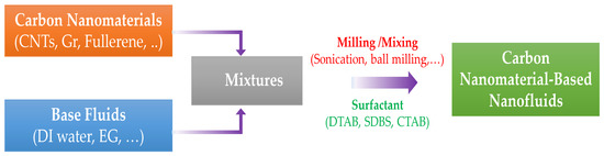 Generally, there are two main methods used to produce the carbon nanomaterial-based nanofluids, including one-step and two-step methods. For the one-step method, carbon nanomaterials are directly prepared in a fluid using several chemical or physical techniques, while the two-step method includes two separate processes: preparing dried carbon nanoparticles and then dispersing them in a base fluid to form a stable suspension. Each method has its advantages and disadvantages. Although the one-step method exhibits good dispersion and stability, the disadvantages including the complexity of the synthesis system and difficulties in controlling the size, shape, and concentration of nanoparticles, making this method less popular in preparing nanofluids. There are only few studies using this method with carbon nanomaterials [69,70]. The two-step method described in Figure 4 is wildly applied to synthesize the carbon nanomaterial-based nanofluids. This method alleviates the disadvantages of the one-step method since the preparation of carbon nanomaterials and nanofluids is dissociated. The size, shape, and concentration of nanoparticles in the nanofluid are controlled more easily. In the process of dispersion, to avoid possible nanoparticle settling that results in poor suspension, it is necessary to employ some techniques such as ultrasonication, mechanical stirring, and surfactants to improve the dispersion and stability of the nanofluids.