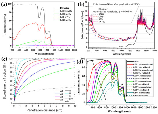 Generally, CNMs considerably decrease the transmittance of the their nanofluids compared to the pure fluid and improve the amount of captured light. This could be due to two issues: (i) the direct absorption of photons by CNMs and (ii) the scattering of light produced by the nanosized particles. The second issue is expected to increase the length of the light path in the fluid, resulting in raising the absorption level. In the case of nanoparticles, which are tested in the wavelength range from 300 to 2300 nm, the Rayleigh scattering regime applies, in which the spectral scattering coefficient varies with the sixth power of the particle size and with the inverse of the fourth power of wavelength [89].
