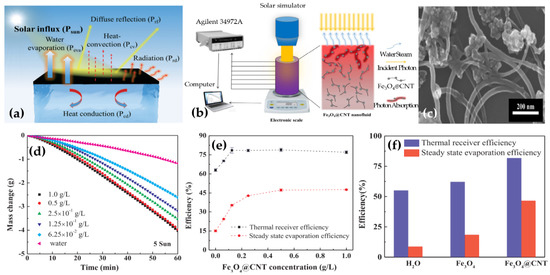 - Shi, L.; He, Y.; Huang, Y.; Jiang, B. Recyclable Fe3O4@CNT nanoparticles for high-efficiency solar vapor generation. Energy Convers. Manag. 2017, 149, 401–408. [Google Scholar] [CrossRef]