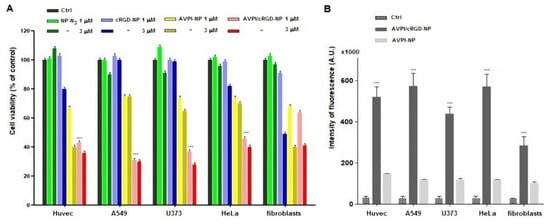As for the peptide–NPs, 1 μM cRGD–NPs showed very little toxicity, and modest toxicity when the concentration was increased to 3 μM. At the concentration of 1 μM, AVPI–NPs induced a decrease of viability of about 25% in A549, U373, and HeLa cells, and of 33% in Huvec and fibroblast cells. At the concentration of 3 μM, AVPI–NPs showed much higher toxicity against Huvec and fibroblasts, reducing their viability by 60%, while the effect was lower in U373, A549, and HeLa cells, whose vitality was decrased by 37% and 30%, respectively. In contrast, 1 μM AVPI/cRGD–NPs significantly inhibited the proliferation of A549, U373, HeLa, and Huvec cells of about 60% and showed a comparatively lower effect towards fibroblasts. Increasing the concentration of AVPI/cRGD–NPs to 3 μM led in general to higher toxicity, whit the exclusion of A549 cells for which the toxicity remained the same.