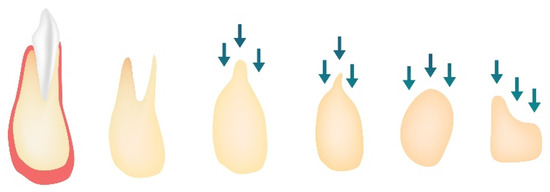The biggest amount of bone loss occurs in the horizontal dimension and happens mainly on the facial aspect of the ridge. On the other hand, vertical ridge height occurs most intensely on the buccal aspect [14]. Long-term lack of tooth in the bone results in increased narrowing and shortening of the ridge, which generally relocates palatally/lingually. Stages of alveolar ridge reduction after tooth loss are presented in Figure 1.