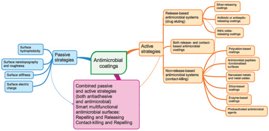 The active concept uses coatings with intrinsic antimicrobial properties. Two different strategies fall in this category, i.e., non-release-based antimicrobial systems that are thought to act by contact killing and release-based (drug-eluting) coatings [95,96]. The first one relies on the covalent immobilisation of the biocidal compounds onto biomedical device surfaces, rendering them antimicrobial properties. The second strategy is based on physical immobilisation of the biocides into matrix coatings from which after implantation, the biocides are gradually released into the surrounding environment through various mechanisms such as bulk and surface erosion, diffusion, and osmotic pressure. Different encapsulation techniques such as solvent displacement, emulsion-solvent diffusion, emulsion-solvent evaporation, salting out, coacervation, and layer-by-layer assembly can be used to incorporate the active ingredients into the antimicrobial coatings. The antibacterial activity may rely on different mechanisms and compounds: polycations that are able to disrupt the bacterial cell wall allowing the cell contents to spill out; antimicrobial peptides; antimicrobial enzymes that are able to degrade the chemical constituents of the biofilm matrix (DNA, polysaccharides, proteins); antibiotics that interfere with microbes vital metabolic processes such as cell respiration, cell division, or cell wall synthesis; antiseptics; and QS inhibitors that interfere with the bacterial sensing network [96,97]. Antimicrobial coatings targeting inhibition of the transition of the planktonic phenotype of bacteria into a sessile type represent another promising strategy [98]. Multifunctional coatings that combine the above two approaches exhibiting both antiadhesive and antimicrobial properties have also been designed.