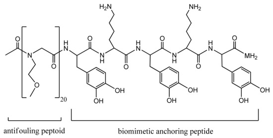 For instance, Statz et al. designed a peptide–peptoid polymer conjugate composed of an antifouling peptoid chain and a biomimetic anchoring peptide. The antifouling peptoid portion consists of a glycine polymer N-substituted with a methoxyethyl side chain resembling the polar repeating units of the hydrophilic PEG polymer, as shown in Figure 2 [102]. The C-terminal surface anchoring peptide was inspired by the mussel adhesive proteins (MAPs), enabling marine mussels to attach to underwater surfaces strongly. Thus, this surface anchor is composed of the following amino acid sequence: L-3,4-dihydroxyphenylalanine (DOPA)–lysine (Lys)–DOPA–Lys–DOPA. The designed bioinspired peptidomimetic polymer exhibited strong antifouling properties resisting mammalian cell attachment for more than five months [102].
