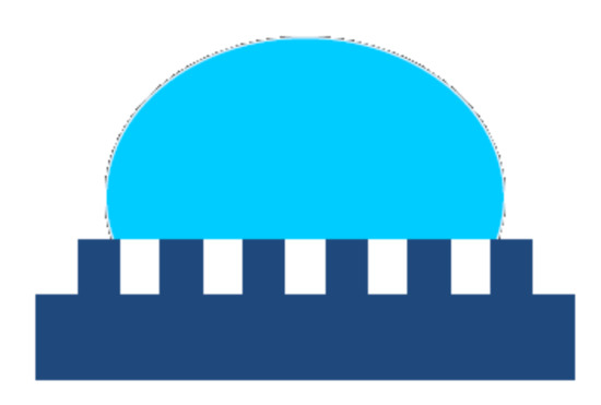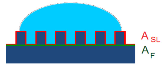 Wenzel’s model assumes that the liquid droplet fills up the grooves completely on a rough surface, forming a homogenous interface with the solid (see schematic representation in Figure 3). According to Wenzel, the apparent contact angle (θ) can be related to the Young contact angle on an ideal smooth surface (θ0) by Equation (2). The proportionality constant Rf in Equation (2) is called the roughness factor, which accounts for the extension of the surface area due to the roughness being defined as the ratio of the actual surface area of the liquid–solid interface (ASL) to the geometrically projected area, or in another word, the flat solid–liquid contact area (AF).