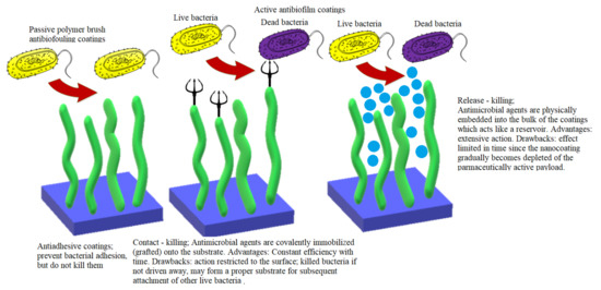 Passive antibiofilm nanocoatings target the early stage of biofilm formation that is bacterial adhesion onto the surface, which is very important, but they do not kill bacteria. The nanoengineering of coatings falling in this category aims to alter the physicochemical properties and/or topological features of the substrate surface in such a way that the bacteria-substrate interactions become unfavourable. However, the efficacy of this approach depends on the type of adhering bacteria, on the type of the substrate, and on the environmental conditions. According to the actual antibiofouling mechanism, passive strategies can be further subdivided into two categories: fouling resistance strategies and fouling release strategies, respectively [99]. Biofouling can be effectively prevented either through the surface modification of biomedical devices by coating them with various types of polymers such as hydrophilic polymers, zwitterionic polymers, hydrophobic polymers, or via the creation of bioinspired low-adhesion superhydrophobic self-cleaning surfaces by engineering surface nanotopography and roughness [100].