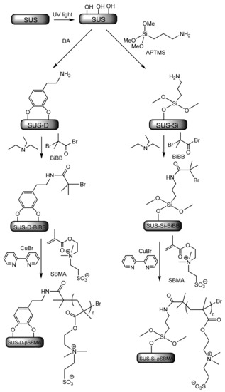 Due to the very strong electrostatic interactions existing in zwitterionic polymers, they have a very tightly bound hydration layer resulting in “superhydrophilicity” and high anti-bioadhesion properties [100]. Using a grafting from strategy, Sin et al. [109] prepared surface grafted poly(sulfobetaine methacrylate) (pSBMA) brushes by atom transfer radical polymerisation (ATRP). Self-assembled layers of polydopamine (PDA) and organosilane were used as a surface anchor on stainless steel coupons (SUS) for the coupling of pSBMA brushes. The synthetic procedure is depicted in Scheme 2. Cleaned SUS 316L coupons were subjected to UV irradiation for 20 min, followed by cleansing with ethanol and deionised water. For PDA as an anchoring agent, SUS coupons were dipped in buffered ((tris(hydroxymethyl)aminomethane or TRIS) aqueous dopamine solution followed by rinsing with ethanol and deionised water to remove excess unbound dopamine. For organosilane as an anchoring agent, SUS coupons were immersed in a solution of 3-aminopropyl trimethoxysilane (APTMS) in hexane at 40 °C for 2 h, followed by cleansing with ethanol and deionised water. Next, SUS 316L coupons were reacted with 2-bromoisobutyryl bromide (BiBB) under an inert atmosphere, in the presence of the hydrobromic acid scavenger, triethylamine, when the self-assembled anchor layers of the ATRP initiators SUS-D-BiBB, and SUS-Si-BiBB, respectively, were obtained (see Scheme 1). Eventually, ATRP of [2-(Methacryloyloxy)ethyl]-dimethyl(3-sulfopropyl)-ammonium hydroxide (SBMA) was carried out for 24 h, in the presence of Cu(I) bromide as a catalyst, and of 2,2′-bipyridine as a ligand, with deoxygenation (under nitrogen stream). The prepared grafted zwitterionic polymer brushes SUS-D-pSBMA and SUS-Si-pSBMA showed good antibiofouling properties being able to resist fibrinogen, blood platelets, and leukocytes adsorption. Hence, they are promising candidates for thrombogenic coatings. Moreover, only 0.8% E. coli adhesion and 0.02% S. epidermidis adhesion were observed on SUS-D-pSBMA [109].