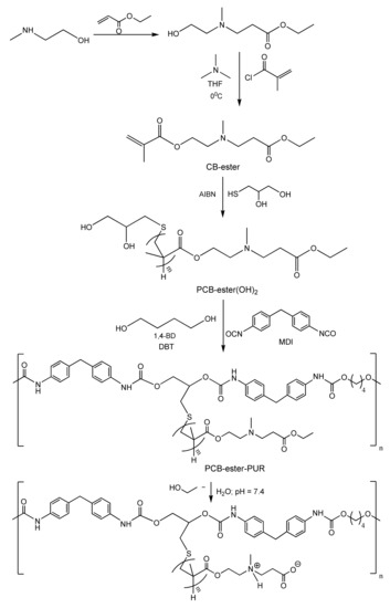 Antiadhesive polymer brush coatings with higher mechanical strength and ability to self-regenerate have been prepared by Wang et al. [110] based on hydrophobic polyurethane with hydrophobic poly(carboxy betaine) esters as side chains, which can be converted into the corresponding nonfouling zwitterionic poly(carboxybetaines) through hydrolysis. The advantage of this approach resides in combining in one material the mechanical strength and hardness imparted by the hydrophobic polymer matrix with the antifouling and self-healing abilities brought by the zwitterionic poly(carboxybetaine) segments formed at the outer surface of the polyurethane film through the hydrolysis of the poly(carboxybetaine) ester side chains. The synthetic pathway comprises three steps: (1) the synthesis of the carboxybetaine ester analog (CB-ester), (2) the synthesis of the dihydroxy-terminated poly(carboxybetaine) ester analog (PCB-ester(OH)2) side chains, and (3) the synthesis of polyurethane with PCB side chains (PCB-ester-PUR). The first synthetic step involves the Michael addition of 2-(methylamino) ethanol to ethyl acrylate followed by the reaction of the resulted intermediate addition product with methacryloyl chloride at 0 °C, in the presence of triethylamine (see Scheme 3). The second step consists in the free radical polymerisation of CB-ester in the presence of azobisisobutyronitrile (AIBN) as an initiator and of 3-mercapto-1,2-propanediol as a chain transfer agent to control the polymerisation degree, m. The stepwise polycondensation reactions of the macrodiol PCB-ester(OH)2 with 4,4′-diphenylmethane diisocyanate (MDI) and 1,4-butanediol (1,4-BD) as a chain extender complete the synthesis. The eventual polycondensation reactions were carried out under nitrogen atmosphere. At the same time, chain extension of NCO-terminated prepolymers was performed in the presence of dibutyltin dilaurate (DBT) as a catalyst. Hydrolysis of the hydrophobic PCB-ester side chains on the surface of the polymer brush matrix at the physiological pH of the blood plasma converts them into zwitterionic poly(carboxybetaines), rendering the surface resistant to protein adsorption and bacterial cell attachment for a long period. By hydrolysis, the surface of the polymer brush coatings is regenerated and its nonfouling properties are restored, thereby releasing all attached microbes as proved by the strong inhibitory effect on bacterial and human umbilical vein endothelial cell (HUVEC) attachment as well as on non-specific protein adsorption [110].
