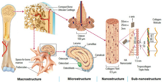 The human skeleton exhibits a hierarchical structure of the macro-, micro-, and nano-scale levels, as seen in Figure 1 [62]. Bone consists of organic (type I and type IV collagen and fibrillin) and inorganic mineral (hydroxyapatite, HA) constituents. Considering the bone structure and density, its structure can be classified into two main types of bone: trabecular bone (cancellous bone) and cortical bone (compact bone). Cancellous bone is made of a porous network, and its porosity is in the range of 50–90%, depending on the specific location and age. Compact bone has a compact structure with a porosity in the range of 3–12% [14,63,64].