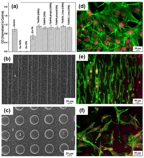 (a) XTT (Dimethoxazole yellow) results of cell viability of MC3T3-E1 fibroblast cells after 24 h in contact with the extracts in the as-received and laser textured surface; (b,c) SEM of the surface of linear geometry and dimple geometry; (d–f) fluorescent micrographs of the as-received, line geometry and dimple geometry showing the attachment of MC3T3-E1 cells. (Reproduced with permission from [126]. Copyright Elsevier, 2015).