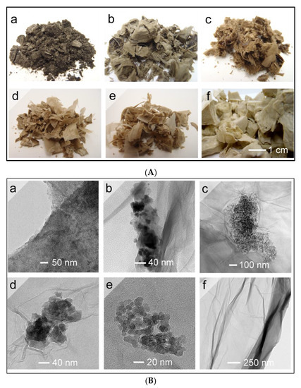 (A) Optical images; and (B) TEM images of: (a) GO-Sn; (b) GO-Fe; (c) GO-Zn; (d) GO-Al; (e) GO-Mg; and (f) GO materials.