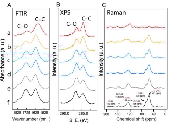(A) FTIR; (B) XPS C1s; and (C) Raman spectrum of: (a) GO-Sn; (b) GO-Fe; (c) GO-Zn; (d) GO-Al; (e) GO-Mg; and (f) GO materials. 13C direct pulse solid-state NMR (MAS) spectrum of GO-Sn, GO-Fe, GO-Zn, GO-Al, GO-Mg and GO materials (speed of rotation: 12.5 kHz).