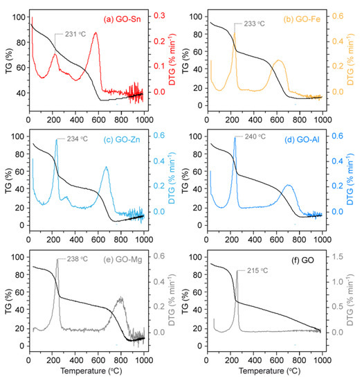 TG and DTG analysis of: (a) GO-Sn; (b) GO-Fe; (c) GO-Zn; (d) GO-Al; (e) GO-Mg; and (f) GO.
