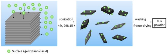 FLG was synthesized by a mechanical exfoliation method that was assisted by tannic acid. Typically, 200 mg of tannic acid (Sigma–Aldrich, Lyon, France) was dissolved in 400 mL of deionized water, and then 400 mg of expanded graphite (provided by Mersen, Courbevoie, France) was added in the beaker in which a sonication probe (Branson UltrasonicsTM Sonicator 400 W) was plunged. Sonication (80 W, 50 kHz, continuous mode) was performed for 4 hours at 298.15 K.
