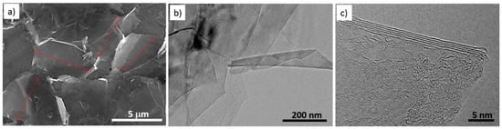 Figure 3 shows the SEM and TEM images of the synthesized graphenic material. SEM (Figure 3a) and TEM low magnification observation images (Figure 3b) both show that the prepared material is under the form of very thin sheets of about 3–5 layers with a thickness typically between 1 and 2 nm (typical image shown in Figure 3c), meaning that the used exfoliation method preferentially produced FLG []. The mean lateral size of the FLG sheets was found around 5 μm on average, as evidenced in Figure 3a.