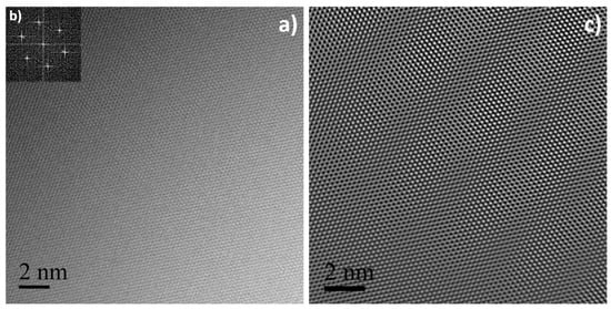 HRTEM and Raman spectroscopy are commonly used as complementary techniques to finely probe the structural quality of nanostructured carbon materials. Figure 4 shows a typical spectra of high-quality graphite (SFG6) and the FLG used in this study. The most intense peak is the G band that originates from the sp2 bonded carbon atoms of the hexagonal lattice of a graphitic structure, and it is well visible around 1580 cm−1 []. The D band, around 1350 cm−1, is related to sp3 defects present in the sp2 carbon atom network []. ID/IG is relatively low for both samples and the ID/IG of graphite is higher than that of FLG, meaning that this latter was of high structural quality. The 2D band, around 2700 cm−1, of higher intensity for FLG is in agreement with the few layer nature of the used graphenic material (Figure 3c). In agreement with Raman spectroscopy, HRTEM, FFT, and IFFT images (Figure 5a–c, respectively) have shown the used FLG has an excellent structural quality with its well noticeable honeycomb carbon atom network [].