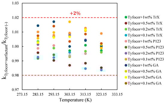 As expected, an enhancement of thermal conductivity of Tyfocor® LS and base fluids was observed with the temperature rise. For the base fluids, this enhancement did not vary with the concentration of surfactant and, over the 40 K temperature domain, the thermal conductivity of the base fluids with Triton X-100, Pluronic® P123, and Gum Arabic increased by 6.4, 7, and 6.3%, respectively. The thermal conductivity of Tyfocor® LS alone and the ratio between the base fluids of the three series (Tyfocor® LS + Triton X-100, Tyfocor® LS + Pluronic® P123 and Tyfocor® LS + Gum Arabic) where the concentration of surfactant was varied between 0.1 and 1% in mass is shown in Figure 7. In all cases, deviations between thermal conductivities of Tyfocor® LS with surfactant and Tyfocor® LS only remained within the 2%. Taking the experimental uncertainty into account, the presence of surfactant (whatever the concentration used) did not significantly impact the thermal conductivity of Tyfocor® LS over the tested temperature range of 283.15–323.15 K.