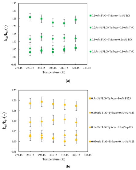 Like for the base fluids, the thermal conductivity of the prepared nanofluids was observed here to increase with both temperature and FLG concentration in agreement with the literature. Figure 8 presents the thermal conductivity ratio for the three series of nanofluids as function of temperature and FLG content. The results show that the thermal conductivity of the base fluids and those of the nanofluids increased with temperature and the relative thermal conductivity of all nanofluids was quasi-constant with the variation of the temperature, within the experimental uncertainty. A similar trend has been previously reported in other works [,,]. It is widely known that the concentration of the nanoparticles plays an important role in improving the thermal conductivity and then heat transfer of nanofluids. As already mentioned, the studied concentration of FLG nanosheets varies between 0.05 and 0.5% in mass. Figure 8 shows that the thermal conductivity of nanofluids increased with FLG content. For the FLG concentration of 0.05, 0.1, 0.25, and 0.5 wt.%, the nanofluid thermal conductivity increases by 4.2, 5.5, 12.2, and 23.9%, respectively, as compared to the corresponding base fluids when using Triton X-100 as a surfactant. The thermal conductivity enhancements are 1.3, 3.0, 9.9, and 18.3% in the case of Pluronic® P-123. Finally, the observed increases in conductivity reach 2.1, 4.0, 10.5, and 21.5% with Gum Arabic. Due to the slight change of thermal conductivity enhancement with temperature, the previous values corresponded to the average of the results in the studied temperature range. A weak dependence in the type of the used surfactant with regards of thermal conductivity enhancement was also observed. One can notice that the enhancement presently reported for the higher FLG concentration is better than the values obtained by Agromayor et al. [], who reported an enhancement of 12% at the mass concentration of 1% of graphene in water at 313.15 K, or by Cabaleiro et al. [] who showed an enhancement up to 5% for 0.5 wt.% of sulfonic acid-functionalized graphene oxide nanoplatelets in ethylene glycol:water mixture at (10:90) wt.% at 323.15 K.