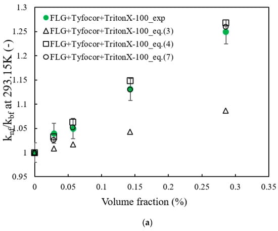 Figure 9 highlights the thermal conductivity ratio of FLG nanofluids at 293.15 K as a function of the volume fraction of FLG. A linear increase in the thermal conductivity ratio with a slight difference in the slope for each used surfactant was observed. In this figure, as well as in the following models, the volume fraction of FLG, denoted and given by Equation (2), was obtained from the FLG mass concentrations , the density of each base fluid was evaluated from mixing rule using the density of each compound at 293.15 K and the density of FLG ρnp measured earlier, as in Equation (2).
