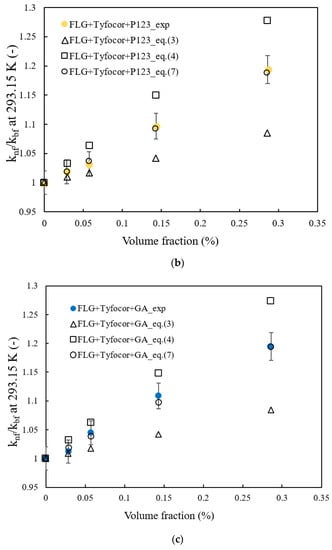 Thermal conductivity ratio of the FLG-based nanofluids over that of the corresponding base fluid at 293.15 K with TritonX-100 (a), Pluronic® P-123 (P123) (b), and Gum Arabic (GA) (c)—Comparison between experimental data and theoretical models from Equations (3), (4) and (7).