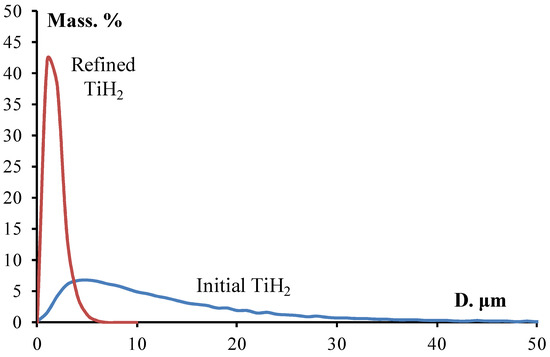 Differential granulometric composition of initial and pre-milled (refined) TiH2.