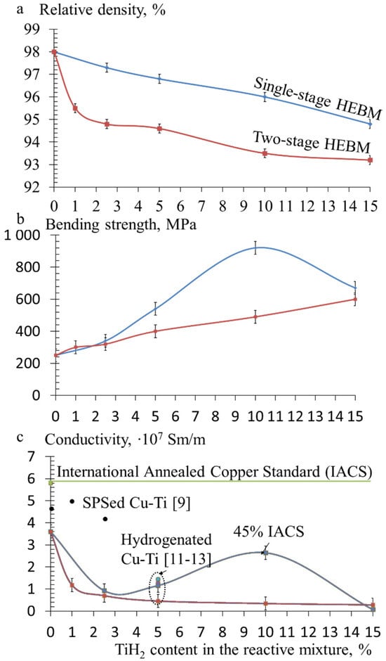 Relative density (a), three-point bending strength (b), and conductivity (c) of Cu-Ti alloys produced by HP using single-stage and two-stage HEBM on TiH2 content in the reactive mixture.