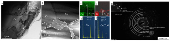 TEM images of HP sample produced using two-stage HEBM (a,b) of Cu-10% TiH2 mixture and corresponding EDS maps (c,d); elemental composition of copper grains and Cu3Ti3O grain-boundary layers measured by EDS (e,f); and characteristic SAED pattern of the sample (g).