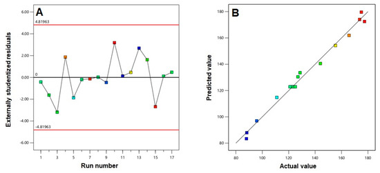Diagnostic plots for flibanserin (FLB) transfersome (TRF) vesicle size: (A) externally studentized residuals vs. run number plot; (B) predicted vs. actual values plot.