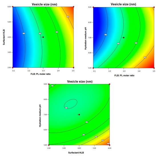 The statistical analysis revealed that all the linear terms corresponding to the three investigated variables have a significant negative effect on FLB TRF size (p < 0.05). The quadratic terms corresponding to the surfactant HLB (X22) and hydration medium pH (X32), in addition to the interaction term X2X3 corresponding to the interaction between the two aforementioned variables, were also found to be significant at the same significance level. Figure 2 illustrates the contour plots for the investigated variable effects on vesicle size.