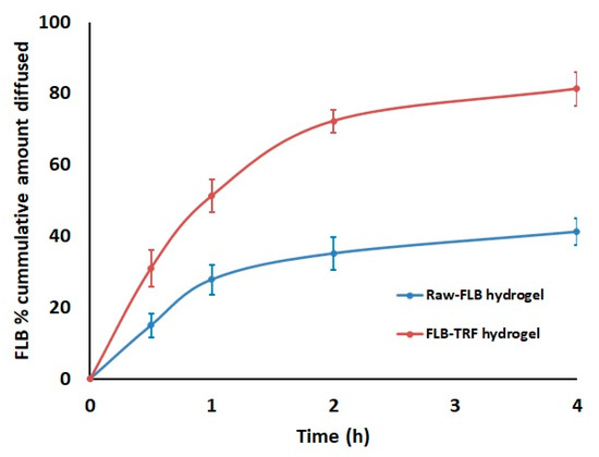 Optimized FLB TRFs were incorporated into hydroxypropyl methyl cellulose (HPMC) based hydrogel. Briefly, specified amount of HPMC (0.1 g) was dispersed in distilled (10 mL) water to make a 1% w/v concentration. The gel was kept in the refrigerator overnight and then FLB TRFs were added with continuous stirring to obtain a drug concentration of 10 mg/g. Control hydrogels incorporating raw drug (10 mg/g gel) were prepared under the same conditions for comparison.