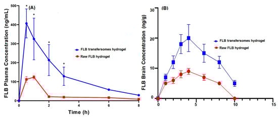 Mean (A) plasma concentrations and (B) brain concentrations of FLB in rats, plotted against time, after nasal administration of FLB-TRF-loaded intranasal hydrogel compared to control raw FLB hydrogel at a dose of 10 mg/kg. Results presented as mean ± SD, n = 6. * Significant at p < 0.05, Sidak’s multiple comparisons test