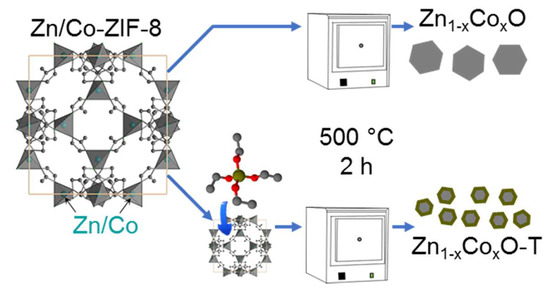 Each Zn/Co-ZIF-8 sample was split into two parts. The first one was used as is. The other one was additionally treated as follows: 300 mg of Zn/Co-ZIF-8 sample was mixed with 5 mL of TEOS at room temperature for two hours (Figure 1). Then, the powder was collected using centrifugation, washed with methanol, and dried in the air. For annealing, 0.05 g of each sample was heated at 500 °C in the air for two hours. The samples are designated according to the Zn/Co molar ratio in the ZIF precursors, while samples obtained with TEOS are pointed by letter T (Table 1).