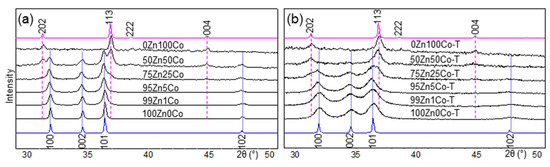 XRD patterns of the obtained oxides without tetraethoxysilane (TEOS) additive (a) and with it (b). Blue profiles in the bottom represent ZnO wurtzite structure, while pink profiles at the top of the figure correspond to the Co3O4 spinel structure. ZnO and Co3O4 profiles were calculated according to crystallographic data from COD sample-ID 2107059 and 1548825, respectively.