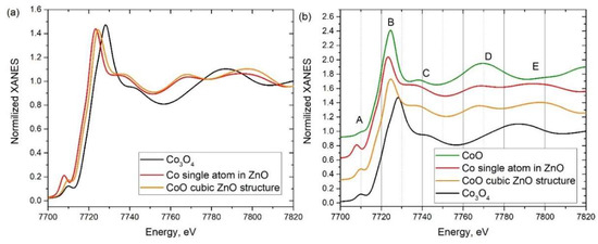 (a) XANES spectra simulated for the model structure of Co3O4 and ZnO with Co substitution. (b) XANES spectra simulated for model Co3O4, CoO, and ZnO with Co substitution.