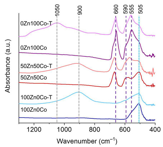 FTIR spectra of the samples are presented in Figure 7. The spectra of samples 100Zn0Co and 100Zn0Co-T contained a peak at 505 cm−1, which can be attributed to zinc oxide with oxygen vacancies [39]. The same peak could be observed on the spectrum of the 50Zn50Co sample, which contained a mixture of wurtzite and spinel structures according to XRD (Table 2). The formation of oxygen vacancies could be associated with the ZIF-8 precursor, which did not contain oxygen. The only source of the last one was air. However, gaseous by-products obtained from the interaction of linkers with oxygen could have reduced its concentration in the reaction area. As a result, synthesized ZnO contained defects in the framework related to oxygen vacancies. In the case of cobalt oxide, the same conditions could have led to a partial reduction of Co3O4. We did not observe the CoO phase on XRD patterns (Figure 2). Therefore, we propose the formation of a partially reduced Co3O4 phase as a defect component or on the surface of the particles. A shoulder at 505 cm−1 observed on spectra of 0Zn100Co and 0Zn100Co-T samples can be attributed to this phase [40]. Modes at 660, 590, and 555 cm−1 could be assigned to vibrations of Co–O bonds in Co3O4. A peak at 660 cm−1 is often associated with vibrations of Co2+ ions in tetrahedral coordination, while modes in 550–590 cm−1 range rise from Co3+ vibrations in octahedral coordination [41,42].